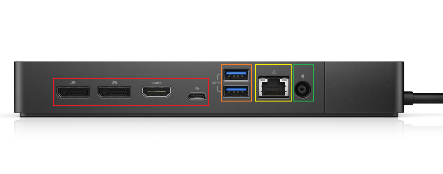 The back of the dock shown in the image below, is where we plug in the monitors, USB, Ethernet, and the power for the dock. We went and labeled the back of the dock with colors to what each port does. We also have made sections to help you find what you are looking for.