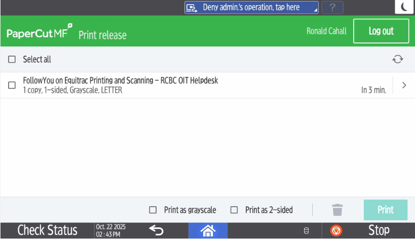 If you clicked Print Release, you will be taken to screen shown here. Select the files you want to print out, then Tap Log out. |