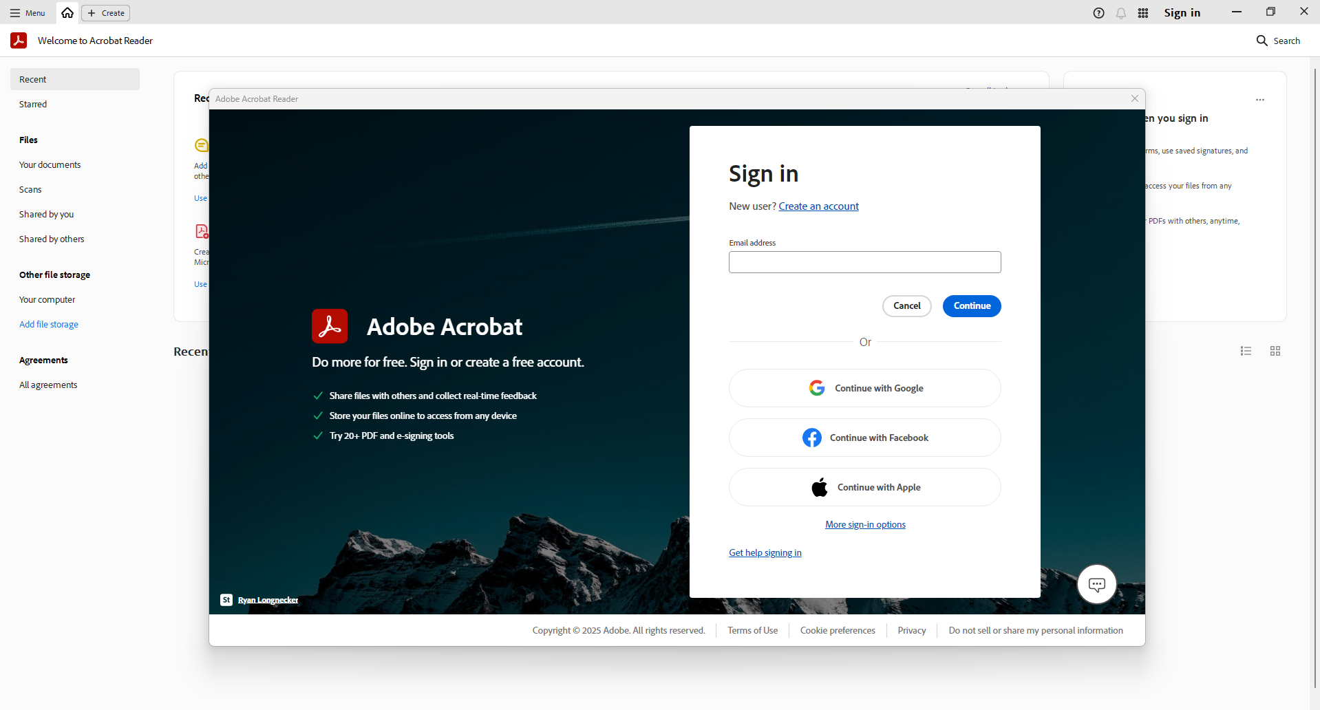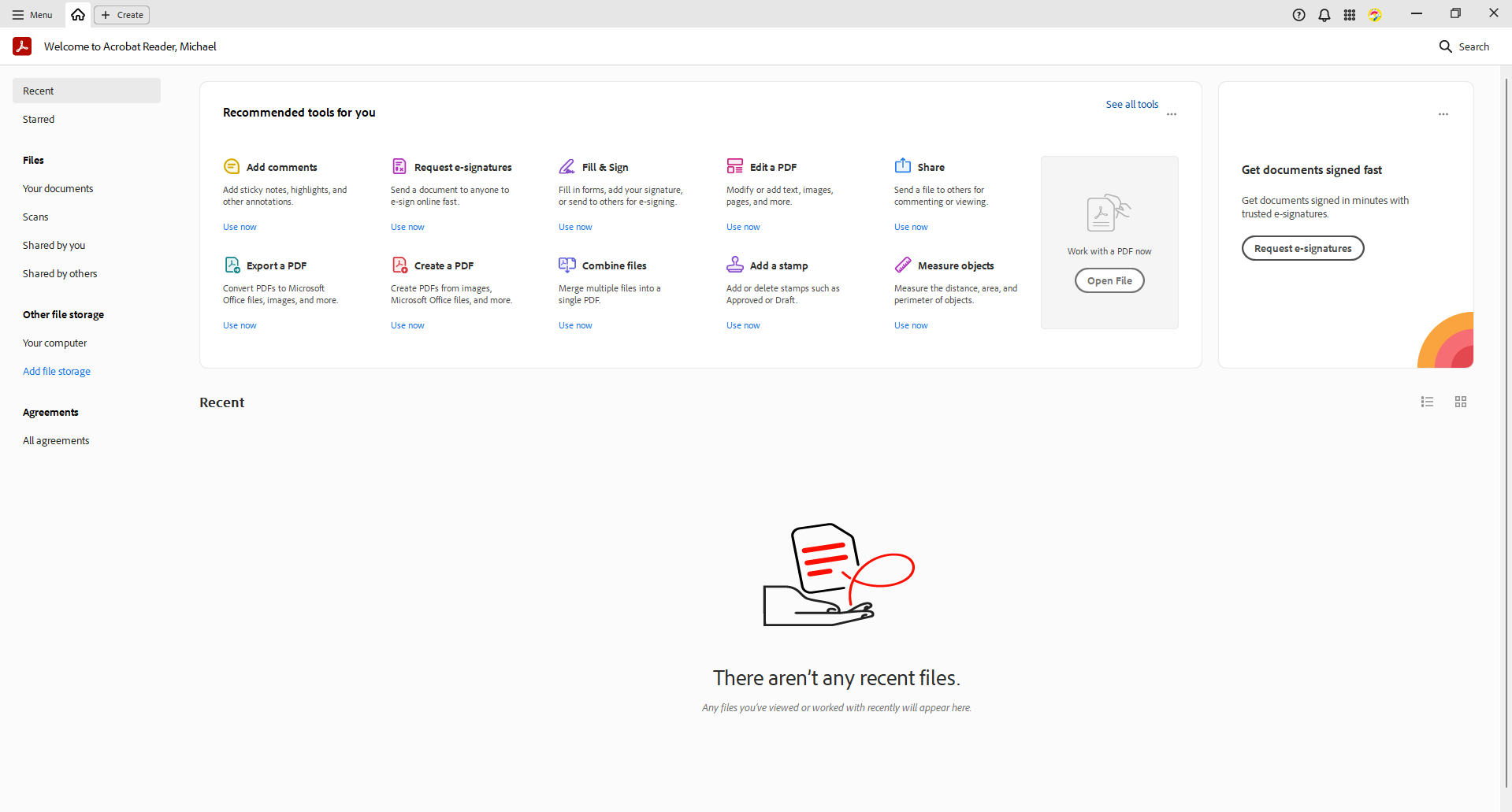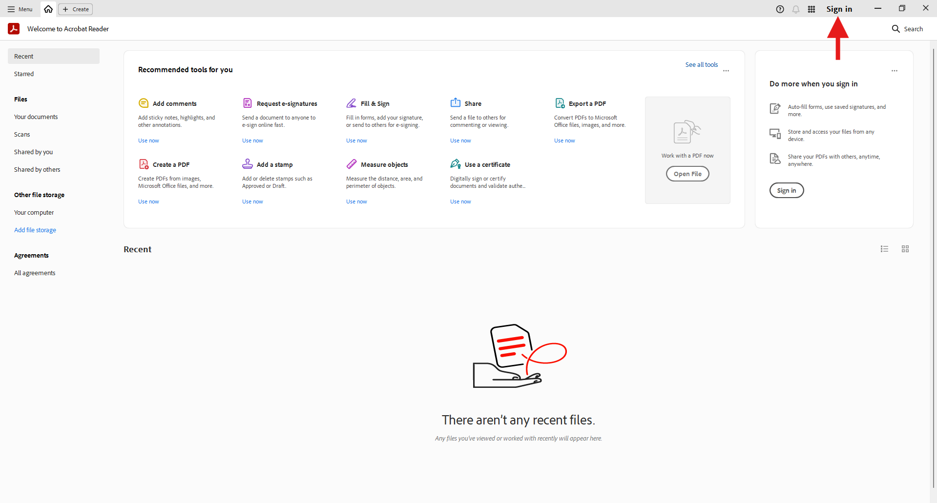 Step 2: After clicking on the application, you will be brought to the Acrobat Reader starting screen. You may have to exit out of a few prompts from Adobe asking if you want to start a free trial. You will now want to click on Sign In on the Top Right of the screen.