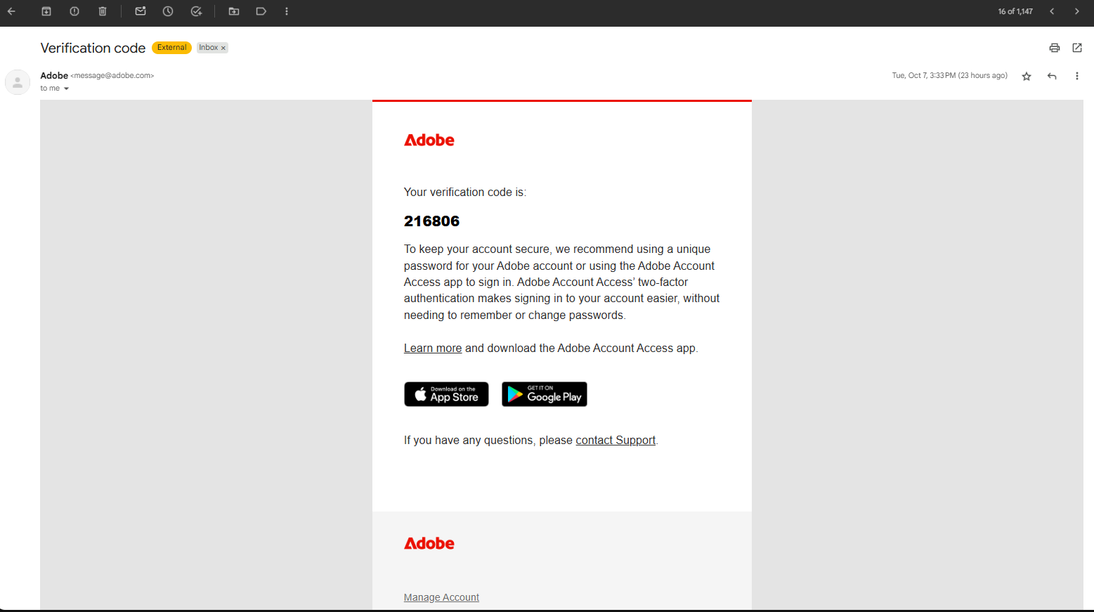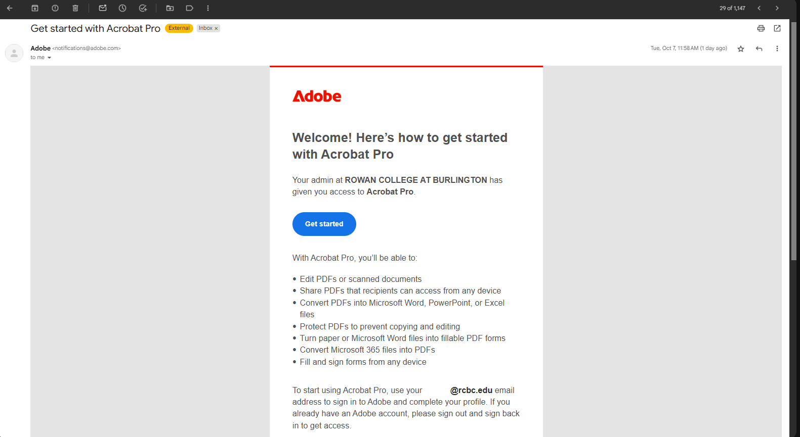 Step 1: Check your RCBC Email for a message from Adobe inviting you to set up your account. The email will look like the image below: