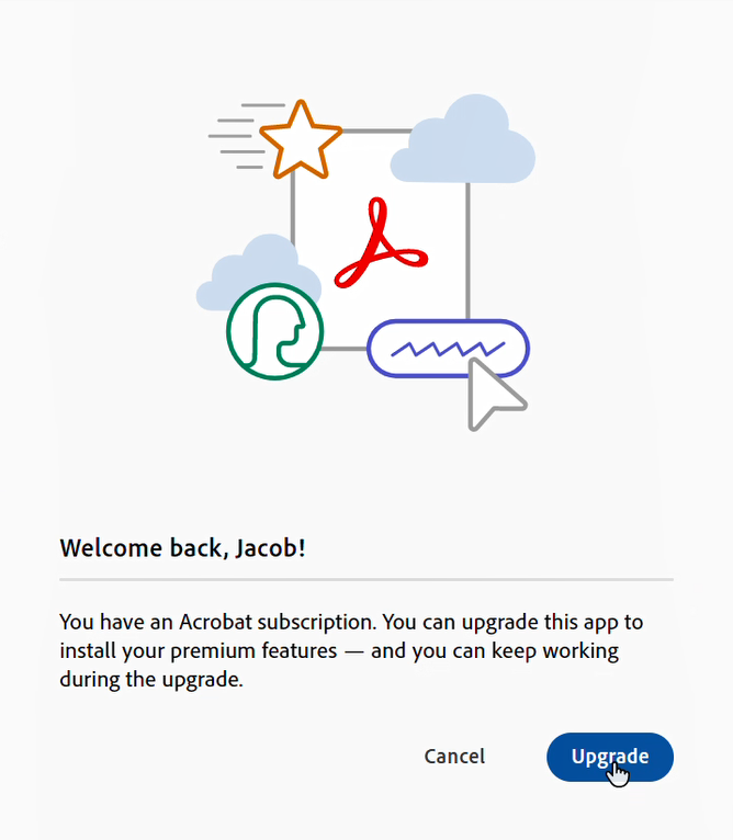 From here give it about a minute for the app to open up a prompt asking for you to upgrade your Adobe program to Pro. It will look like the following image: