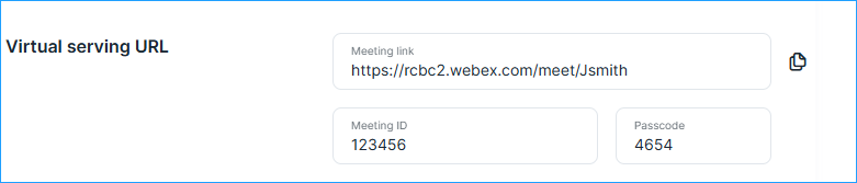 For a Virtual visit, a Meeting URL is required. This URL can be configured in the employee's profile and must be unique to each employee, ensuring that customers connect seamlessly with the correct staff member for their virtual visits.