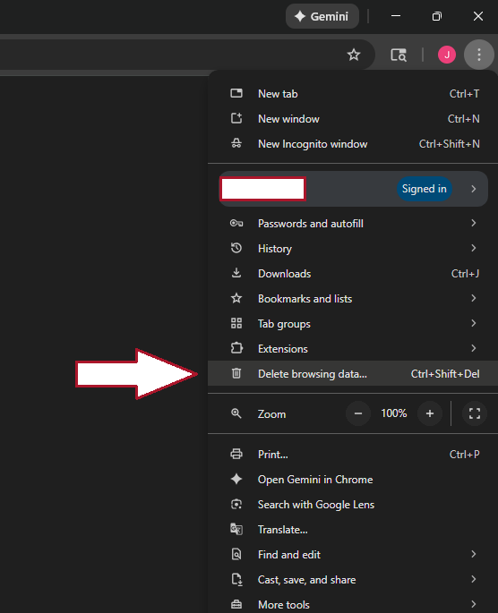 - In the drop-down menu select the "Delete browsing data..." option. (See Image Below)